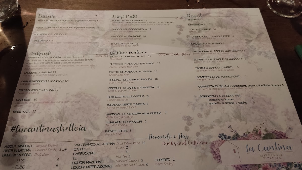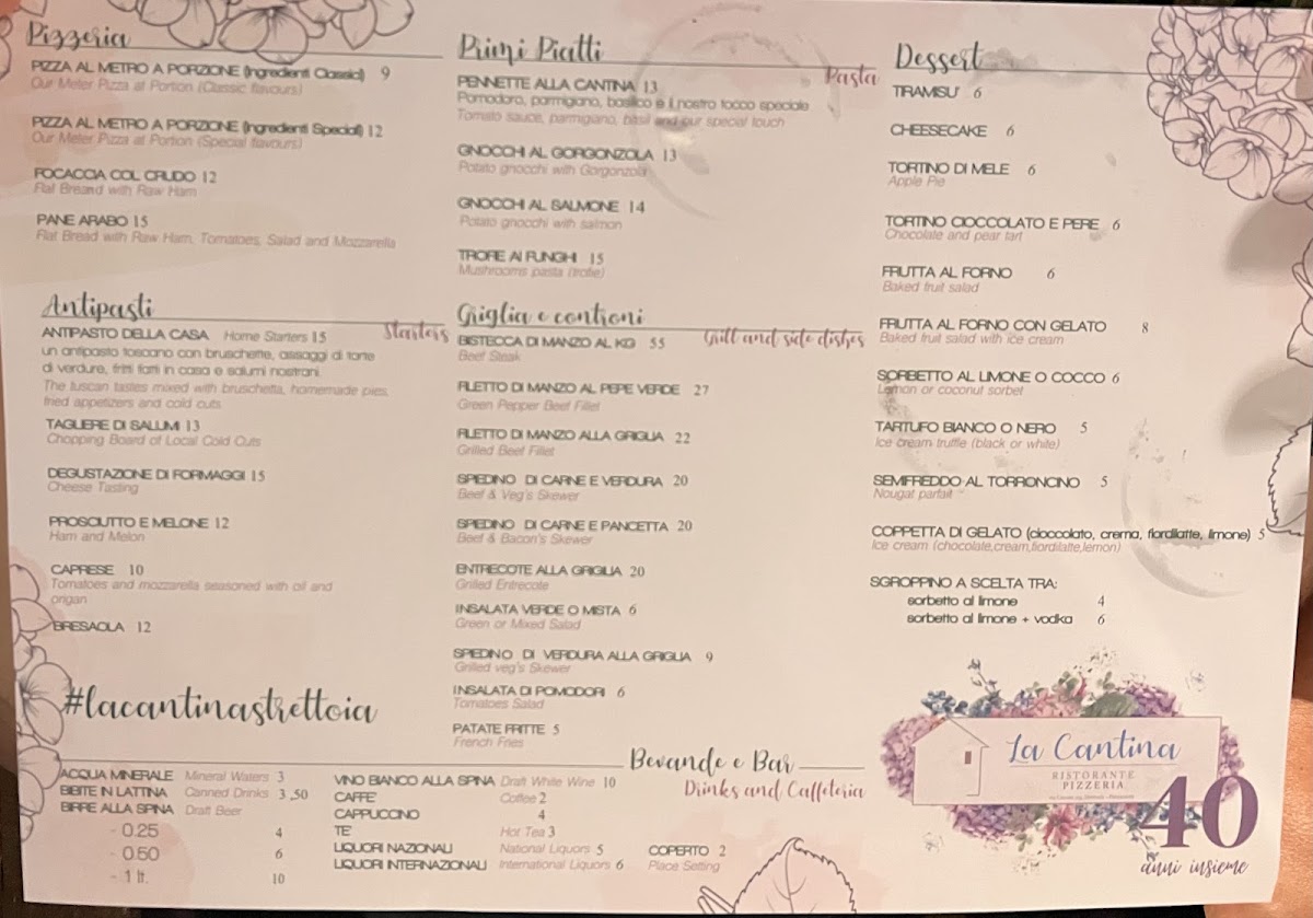 La Cantina Ristorante Pizzeria offers a menu that balances traditional Italian flavors with hearty, satisfying portions. The Pizza Al Metro A Porzione stands out for its generous slices, perfectly baked crust, and fresh toppings that highlight the pizzeria’s artisanal approach. Meat lovers will delight in the Fiorentina Alla Brace, a tender, expertly grilled steak that captures the essence of Tuscan cuisine. For those who enjoy skewers, the Spiedino Carne Di Manzo E Verdure offers a delightful mix of juicy beef and vibrant vegetables, cooked to perfection. Starters like the Antipasto Della Casa set the tone for the meal with a well-curated selection of cured meats, cheeses, and seasonal accompaniments, while the Caprese showcases fresh mozzarella and ripe tomatoes with a drizzle of olive oil. Desserts provide a sweet conclusion, with classics like Tiramisù delivering creamy, coffee-soaked indulgence, Tortino Al Cioccolato E Pere offering a rich combination of chocolate and pear, and La Torta presenting a charming homemade finish. Each dish demonstrates the restaurant’s dedication to quality ingredients and traditional preparation, making the menu both varied and consistently appealing, whether for casual dining or a more celebratory meal.